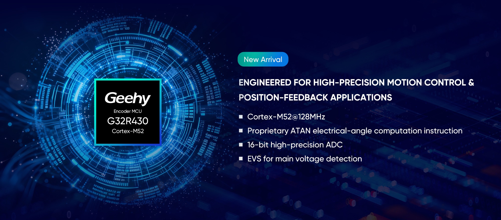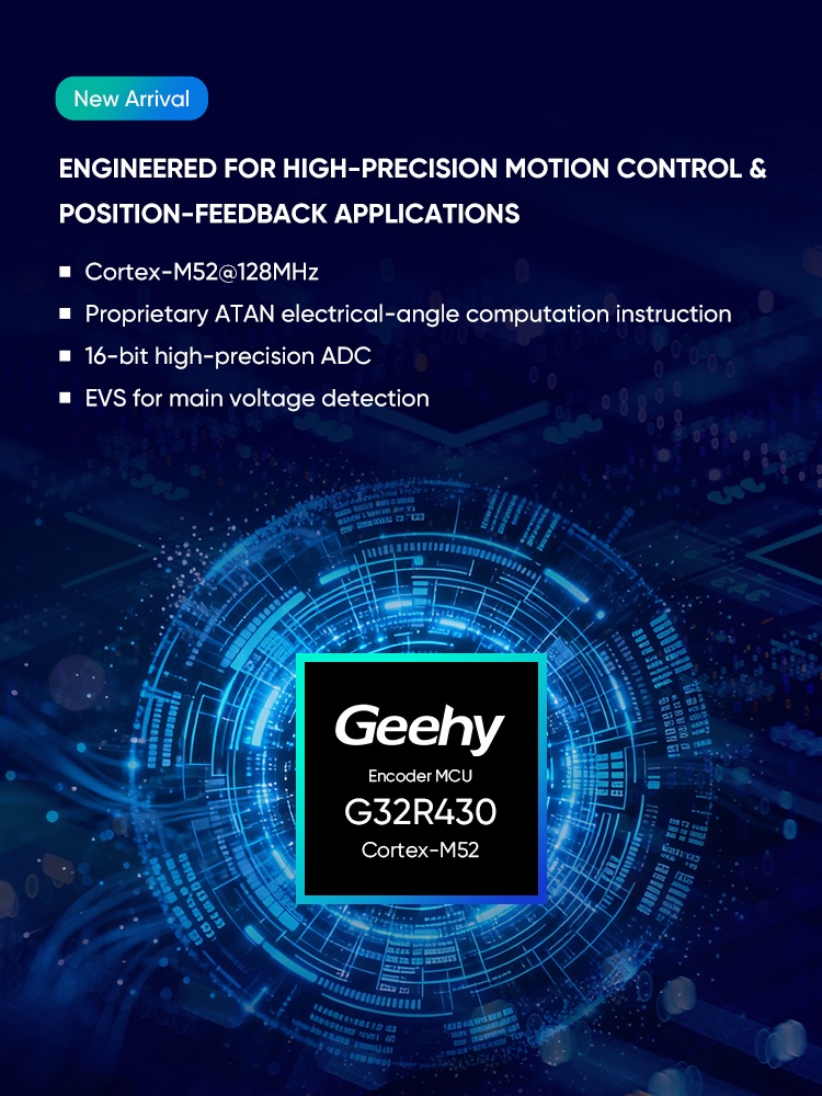 An independently-developed MCU designed for encoder applications, providing precise motion control and position feedback. It features a 128MHz Cortex-M52 core, proprietary ATAN hardware instructions, a 16-bit high-precision ADC, rich analog peripherals, and high-speed interfaces for industrial servos, embodied robots, and intelligent automation systems.