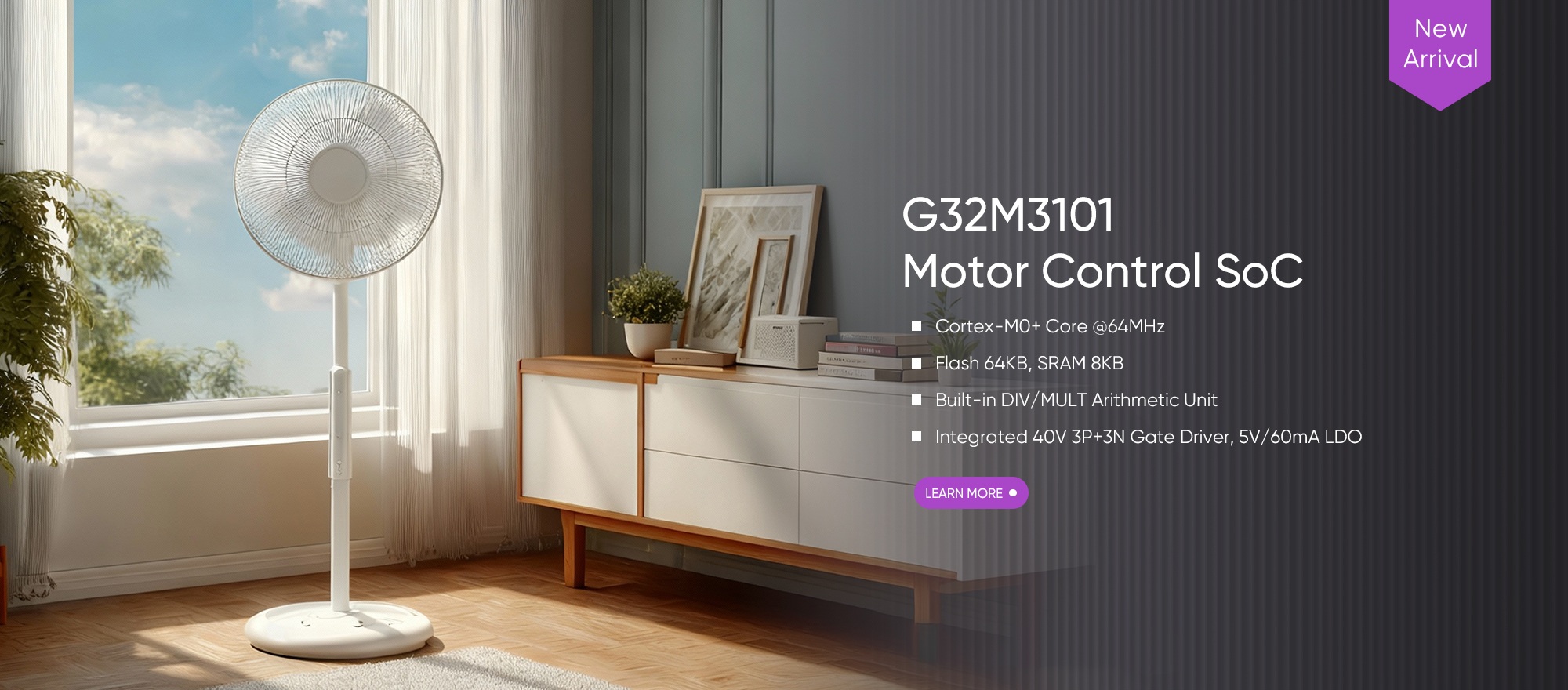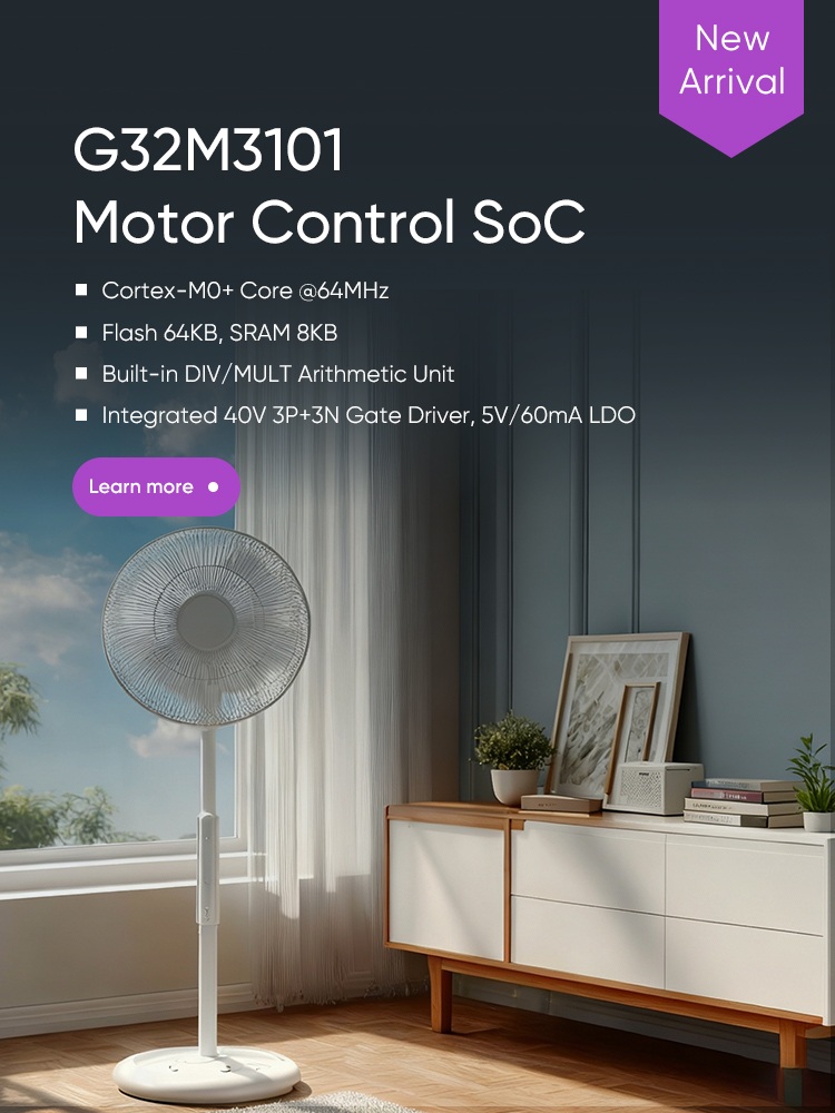 The G32M3101 Motor Control SoC is built on a 64 MHz Arm® Cortex®-M0+ core and integrates a 40V 3P+3N gate driver and a 5V/60mA LDO. Its DIV/MULT arithmetic unit accelerates algorithm processing, and its rich peripheral set makes it ideal for applications like fans, water pumps, air purifiers, pedestal fans, and personal care devices.