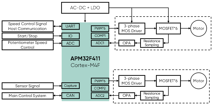 To meet the demands of bidirectional motor control in fresh air systems, Geehy introduces the APM32F411 fresh air system solution. It utilizes a sensorless FOC (Field-Oriented Control) algorithm and dual-resistance sampling to control both intake and exhaust fans.