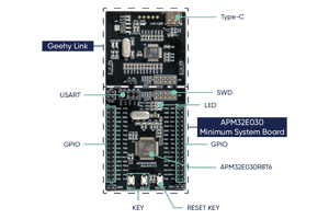 The APM32E030R Micro-EVB is a compact development board for APM32E030x8 MCUs. It features the APM32E030R8T6 MCU with a 72 MHz Arm® Cortex®-M0+ core and 64KB Flash. The board includes Geehy-LINK and an E030 minimum system board. It supports multiple debugging methods, including onboard LINK and Type-C connection. With external I/O ports, buttons, serial interfaces, and essential peripherals, it enables quick simulation and programming.