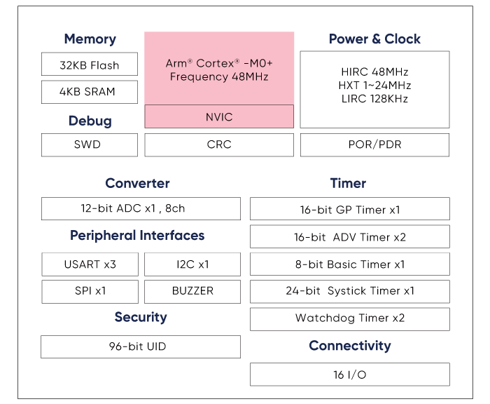 Arm® Cortex®-M0+ - Operates at frequency of 48MHz