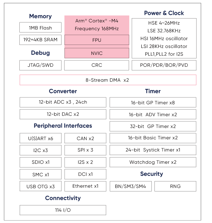 Based on the Arm® Cortex®-M4F core with an FPU unit, the APM32A407 high-performance automotive-grade MCUs deliver extra-large storage, compatibility with BN, SM3, and SM4 encryption algorithms, exceptional real-time computing performance, advanced system interrupt response, diverse communication interfaces, and analog peripherals. This makes them well-suited for addressing body control and connected development requirements.At present, it can be widely used in EV charging station, onboard instrument, tire pressure monitor, matrix headlight, body controller and vehicle positioning terminal.