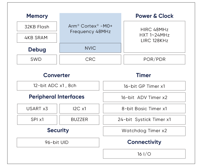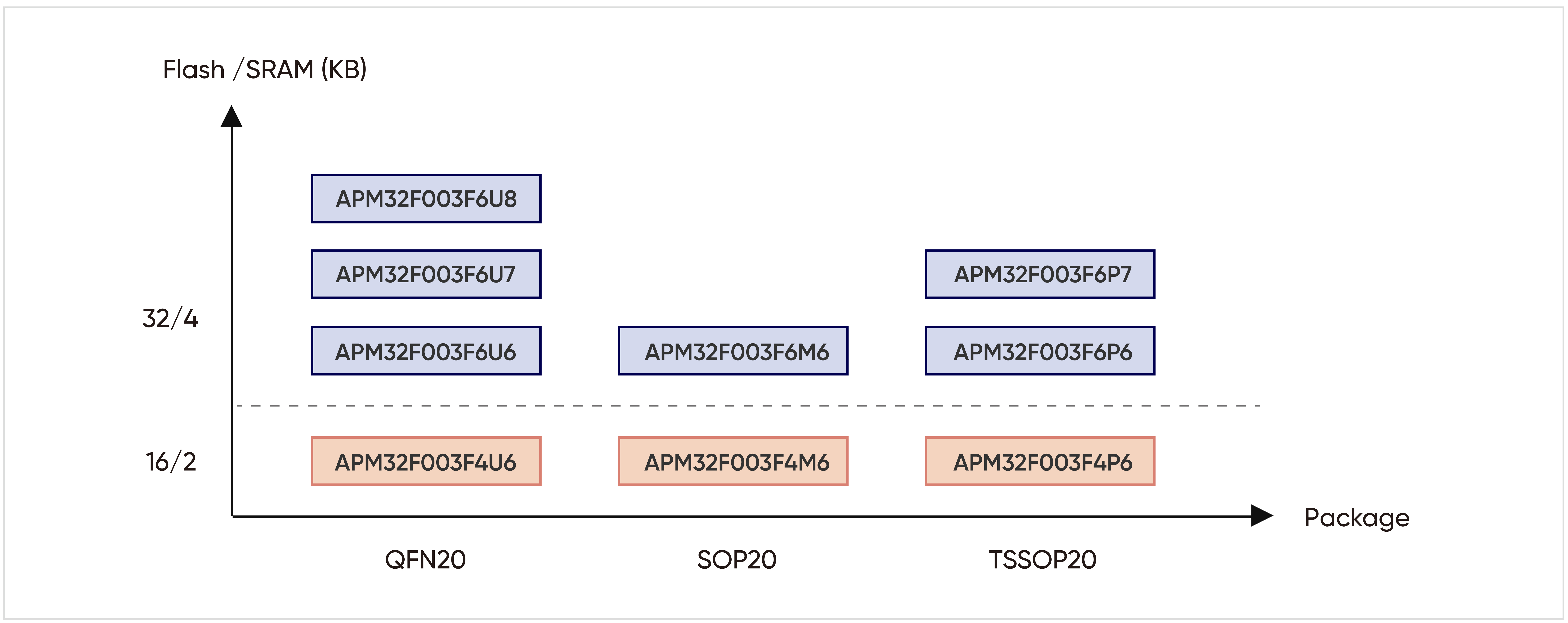 The APM32F003 basic cost-effective industrial-grade MCUs offer a broad temperature range, high precision, low-temperature drift, an 8KV ESD rating, and strong anti-interference capabilities. Integrated with high-speed internal oscillators boasting accuracy within ±3% across the entire range and ±1% after user calibration, these MCUs support TSSOP20, SOP20, and highly compact 3x3mm QFN20 packages, facilitating system integration and reducing the BOM cost.At present, it can be widely used in oil pressure sensor, electric toy, door entry lighting control, educational robot, wireless charger and temperature sensor.
