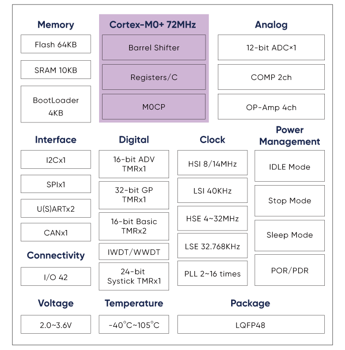 The APM32F035 series is specifically designed for the motor drive market, providing high-performance and cost-effective solutions. These MCUs support a single-cycle 32-bit hardware multiplier and include a built-in M0CP coprocessor. With integrated high-speed ADC, op-amps, comparators, a CAN controller, and other peripherals, they are well-suited for motor control applications. Integrated with a general-purpose motor control ecosystem, these MCUs greatly improve motor drive performance, expediting product iterations and updates.At present, it can be widely used in electric scooters, refrigerator compressors, fans, water pumps, power tools and garden tools.