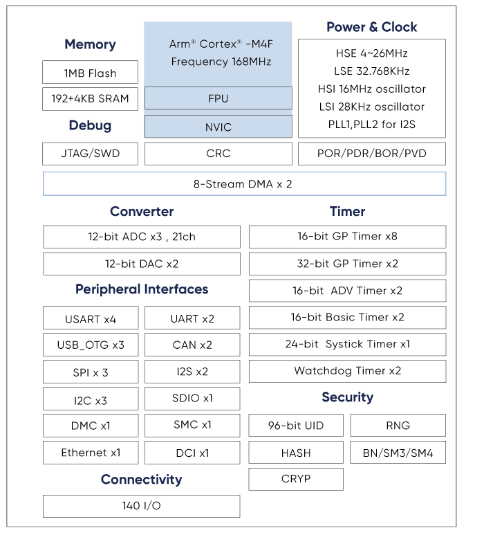 The APM32F417 industrial-grade high-performance MCUs integrate ample fast storage, mixed-signal circuits, and full-speed/high-speed USB with PHY for high-speed OTG HS2. With built-in hardware acceleration engines, it guarantees robust data security by supporting cryptographic algorithms like SM3 and SM4, as well as symmetric encryption standards such as AES, DES, and TDES.At present, it can be widely used in card swipe machine, respirator, power protection, communication equipment, 3D printer and robot controller.