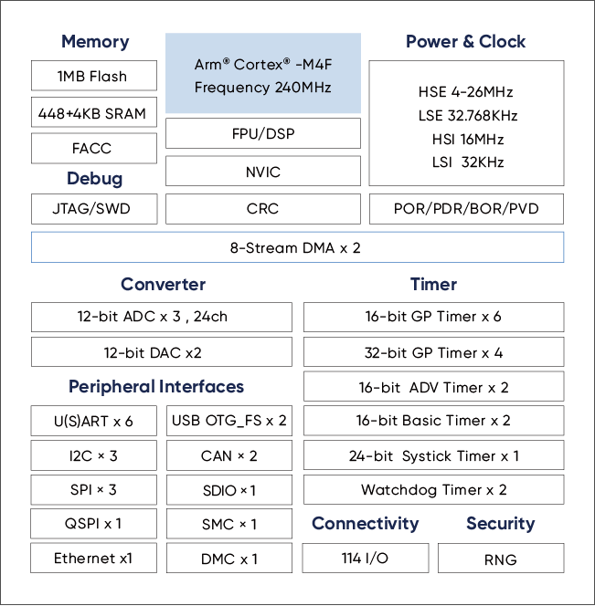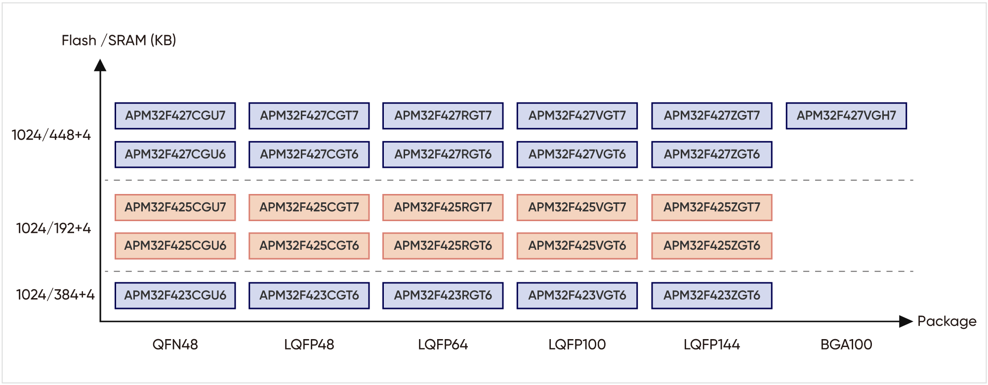The APM32F427/425/423 series is a high-performance industrial MCU running at up to 240 MHz. It provides up to 1 MB Flash and 448 KB SRAM, along with high-speed ADCs, DACs, and multiple communication interfaces, including Ethernet, CAN, USB OTG, and an enhanced EMMC interface for external memory or FPGA connectivity. The APM32F425 also features zero-wait-state Flash for faster real-time program execution. Designed for demanding industrial applications, this series is ideal for PLCs, servo drives, drones, robotics, energy storage BMS, and more.