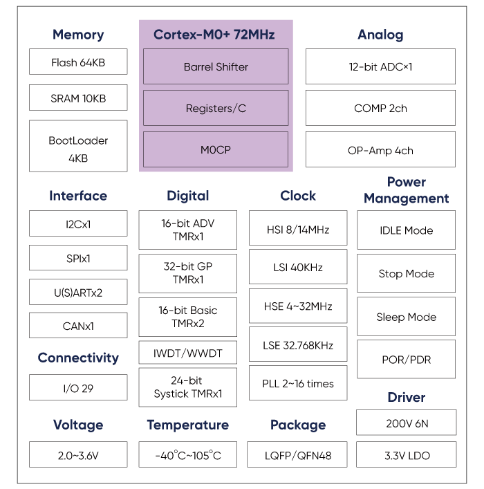 - M0CP coprocessor, its hardware includes: shift unit, 32bit/32bit divider, optional multiply and add operation with saturation, square root (register form), trigonometric function, SVPWM (phase shift function is realized by software)