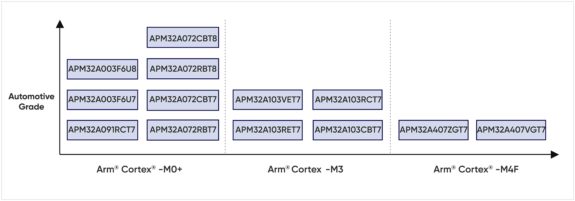 The APM32A series, including APM32A003, APM32A091, APM32A072, APM32A103, APM32A407, equipped with Arm® Cortex®-M0+/M3/M4F cores. These MCUs provide efficient CPU processing, enhanced storage, and robust connectivity. With AEC-Q100 and ISO 26262 certifications, the APM32A series expands Geehy's automotive-grade MCU lineup, meeting high-reliability standards and accommodating a wide temperature range. It is designed to address diverse communication and body control applications, finding applications in vehicle body control, safety systems, infotainment, power systems, and more.