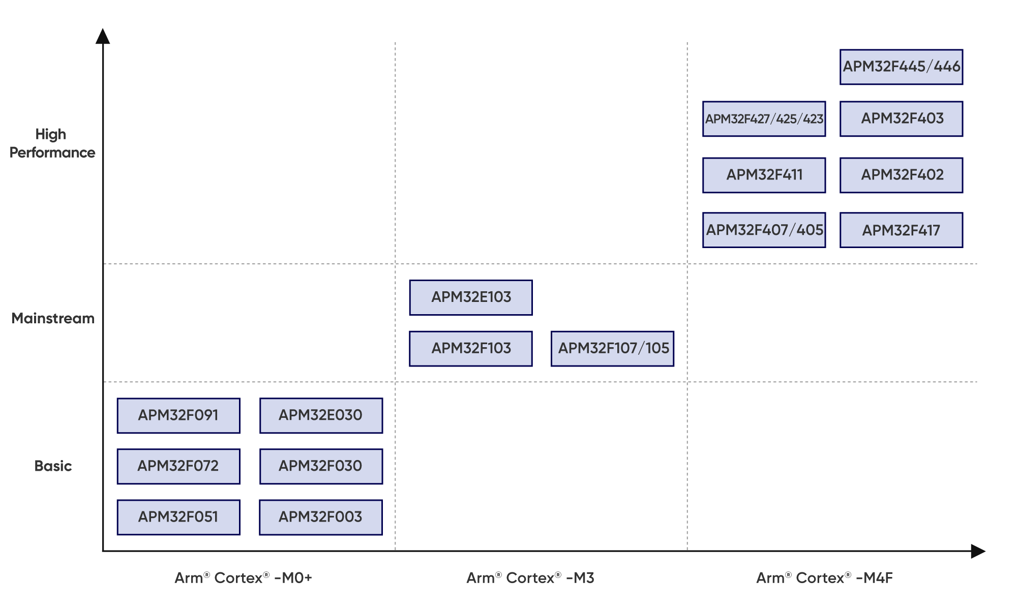 The APM32 series comprises 32-bit MCUs based on Arm Cortex-M0+/M3/M4F cores. These MCUs deliver a blend of high performance, low power consumption, real-time capabilities, stability, security, and versatility, ensuring a rapid, straightforward, and flexible development experience. With diverse models catering to various applications, the APM32 lineup features a robust development ecosystem and finds extensive use in industrial control, automotive electronics, high-end consumer electronics, smart homes, new energy, and communication facilities.